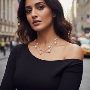 Adorn your wrist with the timeless beauty of this exquisite layered pearl station bracelet. This elegant piece features two delicate rose gold chains, artfully draped to create a chic, multi-layered look that is both modern and sophisticated.