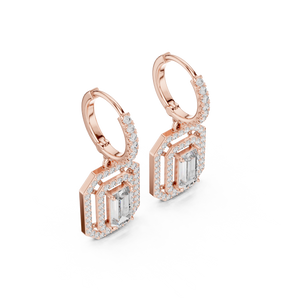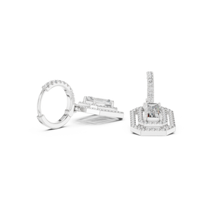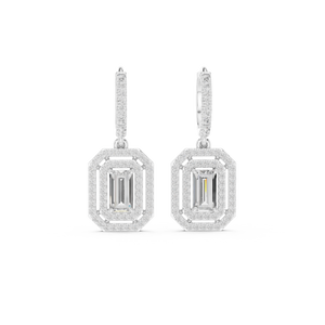 Elevate your evening attire with a nod to vintage glamour. These stunning drop earrings feature a pair of striking emerald-cut lab-grown diamonds, encased in a sophisticated double-octagonal halo of brilliant-cut accents. Suspended from shimmering, diamond-lined huggie hoops, these earrings offer a seamless blend of classic Art Deco geometry and modern sustainable luxury. Crafted in high-polish sterling silver, they are the perfect statement piece for the conscious connoisseur.