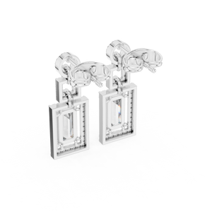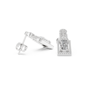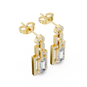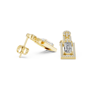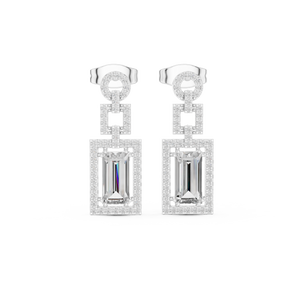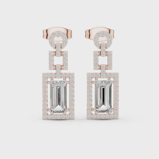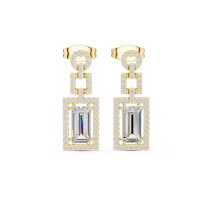 Make a bold statement with these architecturally inspired drop earrings. Each earring features a stunning, center-set emerald-cut lab-grown diamond, framed by a meticulous halo of brilliant-cut accents. The design unfolds in a series of linked geometric shapes—a circle, a square, and a rectangle—creating a fluid, linear silhouette that catches the light from every angle.