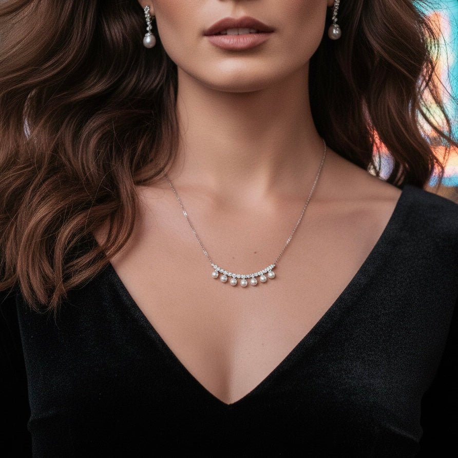 Grace your neckline with this beautifully modern arc necklace. A gracefully curved bar, shimmering with brilliant pavé-set stones, creates an elegant smile of light. From this radiant arc, five lustrous pearls dangle delicately, adding a touch of classic sophistication and gentle movement.