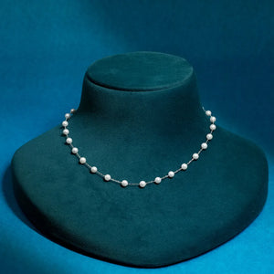 This necklace features perfectly uniform, round pearls interspersed with delicate, polished sterling silver beads. The subtle metallic accents provide a modern twist to the traditional pearl strand, catching the light and adding a touch of contemporary flair. This thoughtful design enhances the natural beauty of the pearls, making the necklace a standout piece for any occasion.