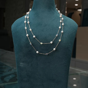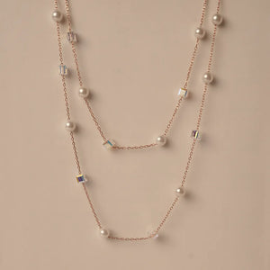 The necklace showcases a harmonious blend of classic and contemporary elements. Lustrous white pearls are elegantly spaced along both chains, offering timeless beauty. Interspersed between the pearls are sparkling, cube-shaped crystals with an iridescent finish, catching the light to reveal a captivating spectrum of colors. This unique combination creates a piece that is both refined and modern.