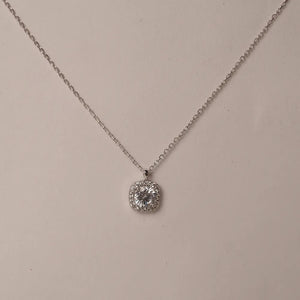 This elegant necklace features a beautifully crafted pendant with a sparkling central gemstone, surrounded by a halo of shimmering crystals, all set in a delicate silver chain.