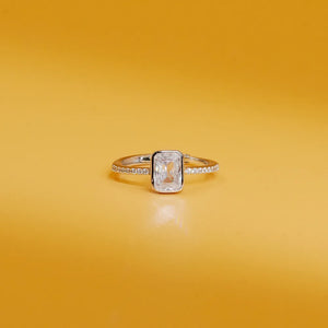 The ring features a striking, emerald-cut cubic zirconia as its centerpiece, celebrated for its long, elegant facets and mesmerizing clarity. The stone is secured in a sleek, protective bezel setting that enhances its geometric beauty. Adding a touch of delicate brilliance, the slender sterling silver band is finely set with a row of shimmering pavé stones along its shoulders, creating a beautiful contrast of textures.
