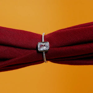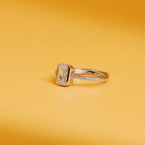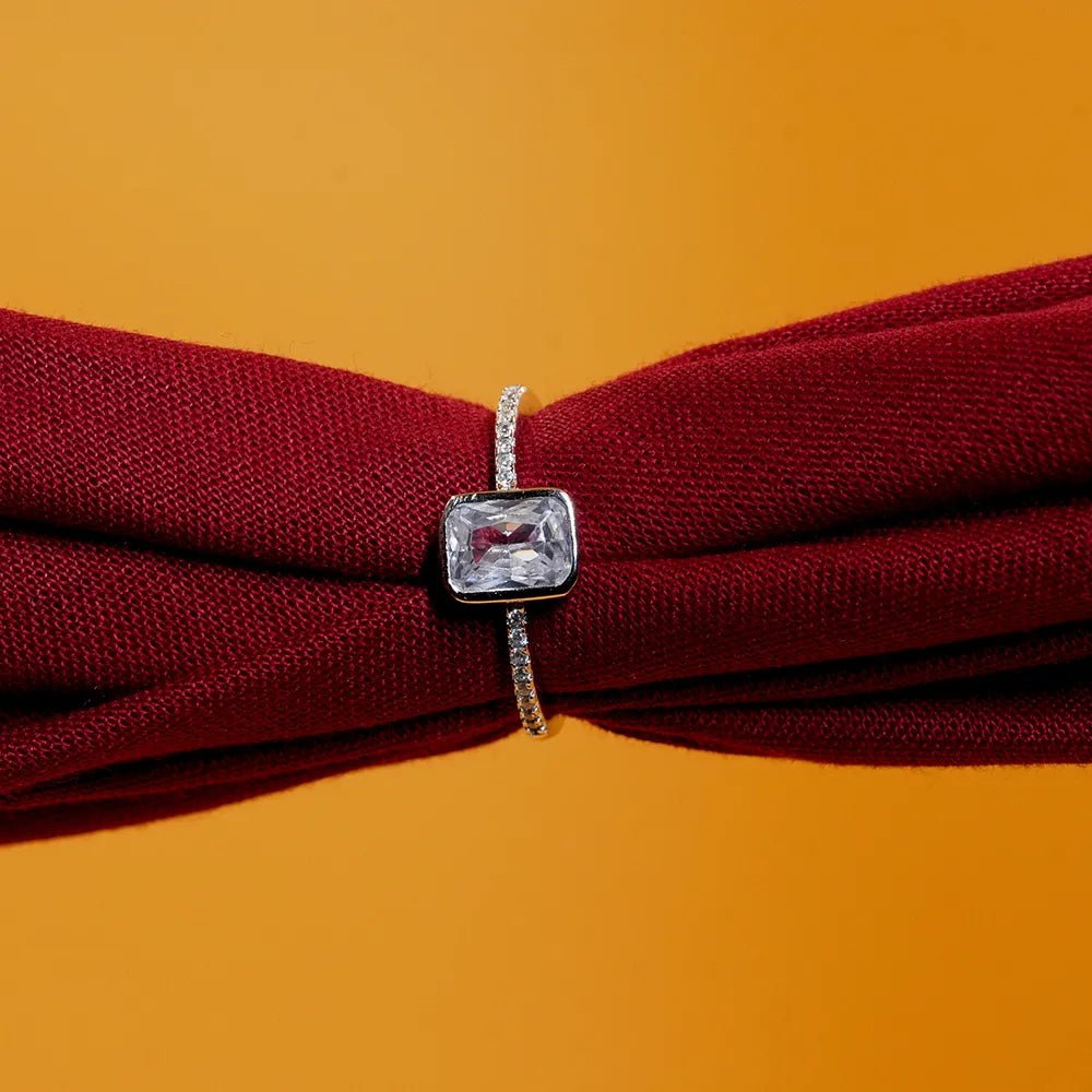 Center Stone: A flawless, emerald-cut cubic zirconia that exudes modern sophistication.