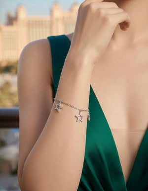 Crafted from luminous sterling silver, this bracelet features a contemporary and lightweight paperclip chain. Gracefully dangling from the chain are two beautiful, open-frame star charms. Each star is meticulously adorned with a surface of brilliant pavé-set cubic zirconia stones that catch the light beautifully, creating a subtle yet captivating glitter. The bracelet is completed with an adjustable extender chain, allowing for a perfect and comfortable fit.